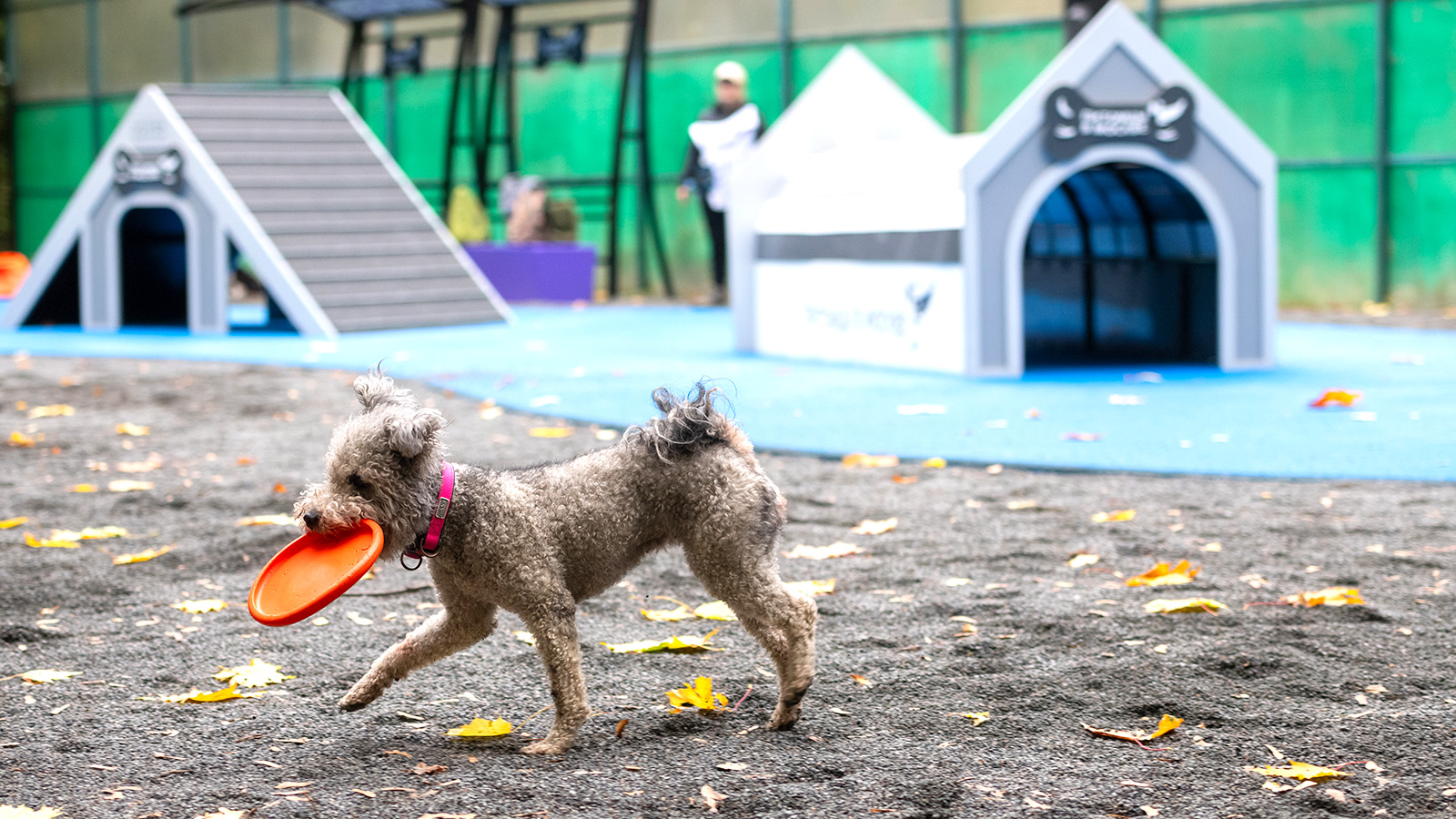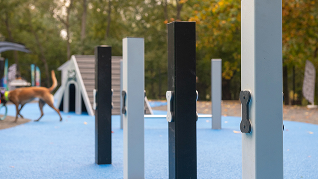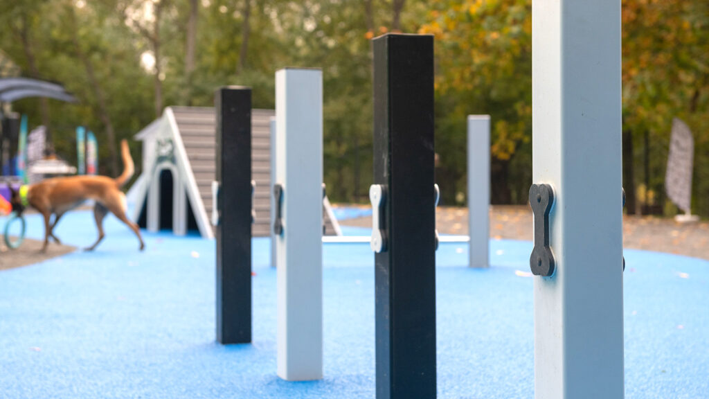 В тренировочной зоне уложено покрытие из резиновой крошки и установлены специальные снаряды: бум для развития координации движений, наклонная стенка, слалом, барьер-перекладина и тоннель.