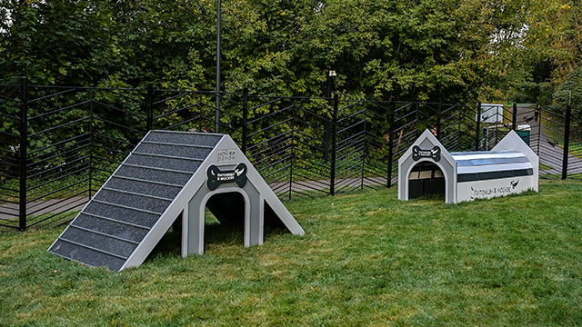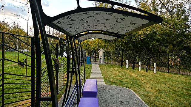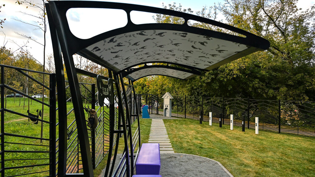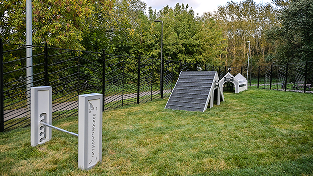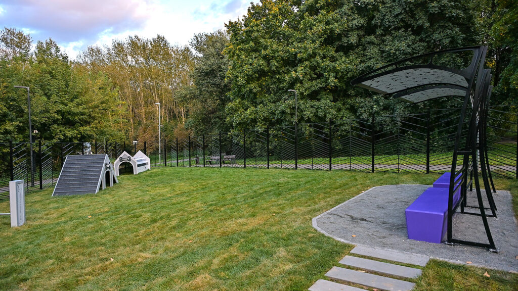 На территории предусмотрена также зона отдыха для хозяев, где посетители могут отдохнуть под навесами. Здесь же установлен стенд с информацией о предстоящих мероприятиях на площадке. Кроме того, территория оборудована урнами для уборки за питомцами.
