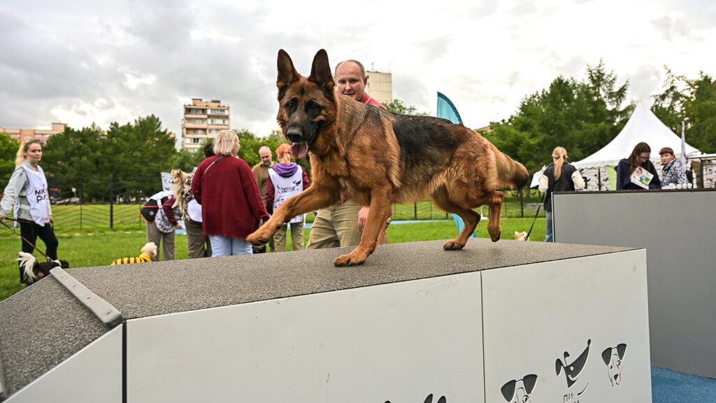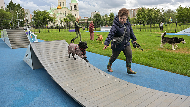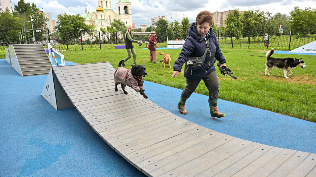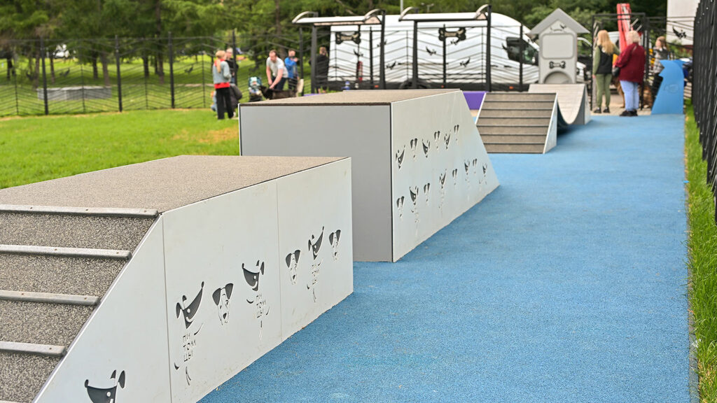 В дрессировочной зоне установлены тренажёры. Например, бум для отработки координации движений, тоннель, который помогает собакам победить страх перед замкнутым пространством, мостик, слалом для тренировки скорости и концентрации и окоп.