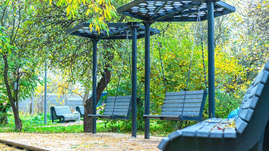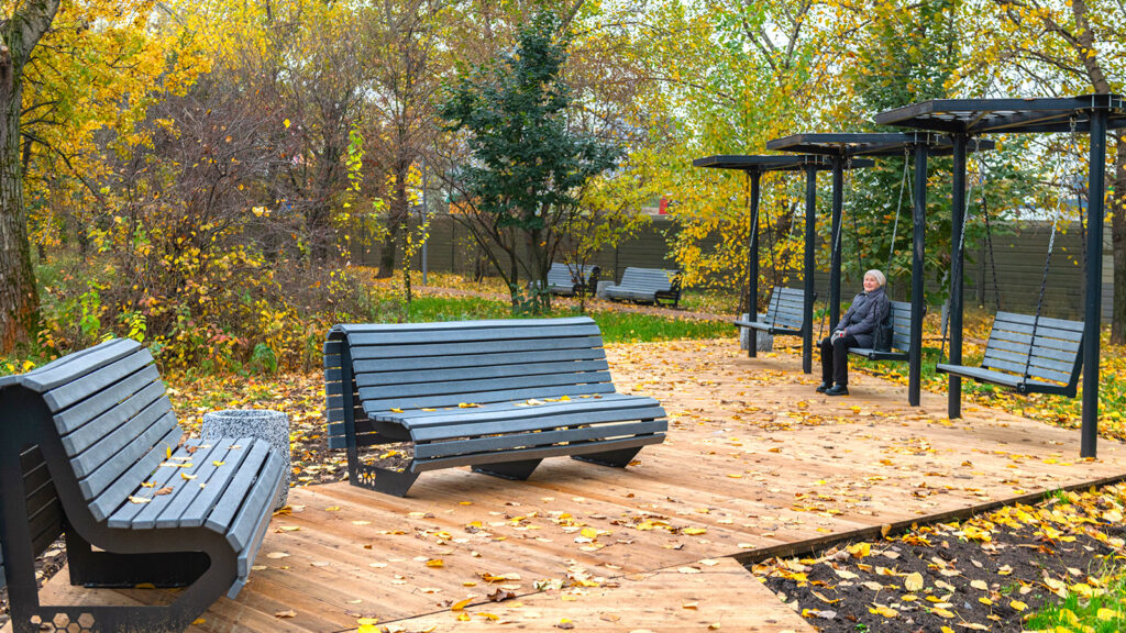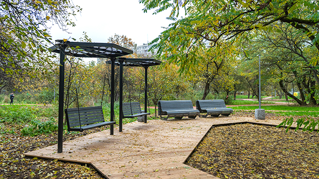 Полностью обновилась пешеходная сеть сада, которая органично вписалась в существующий ландшафт, отдельно выделили дорожки для спортсменов. По всей территории установили разнообразные места для отдыха: лавки, беседки, парковые качели с навесами