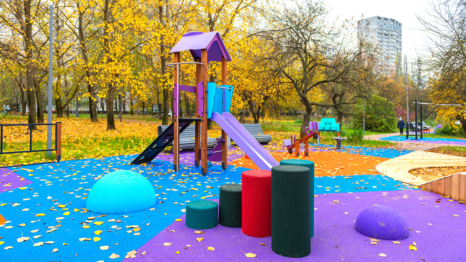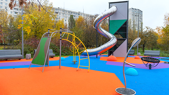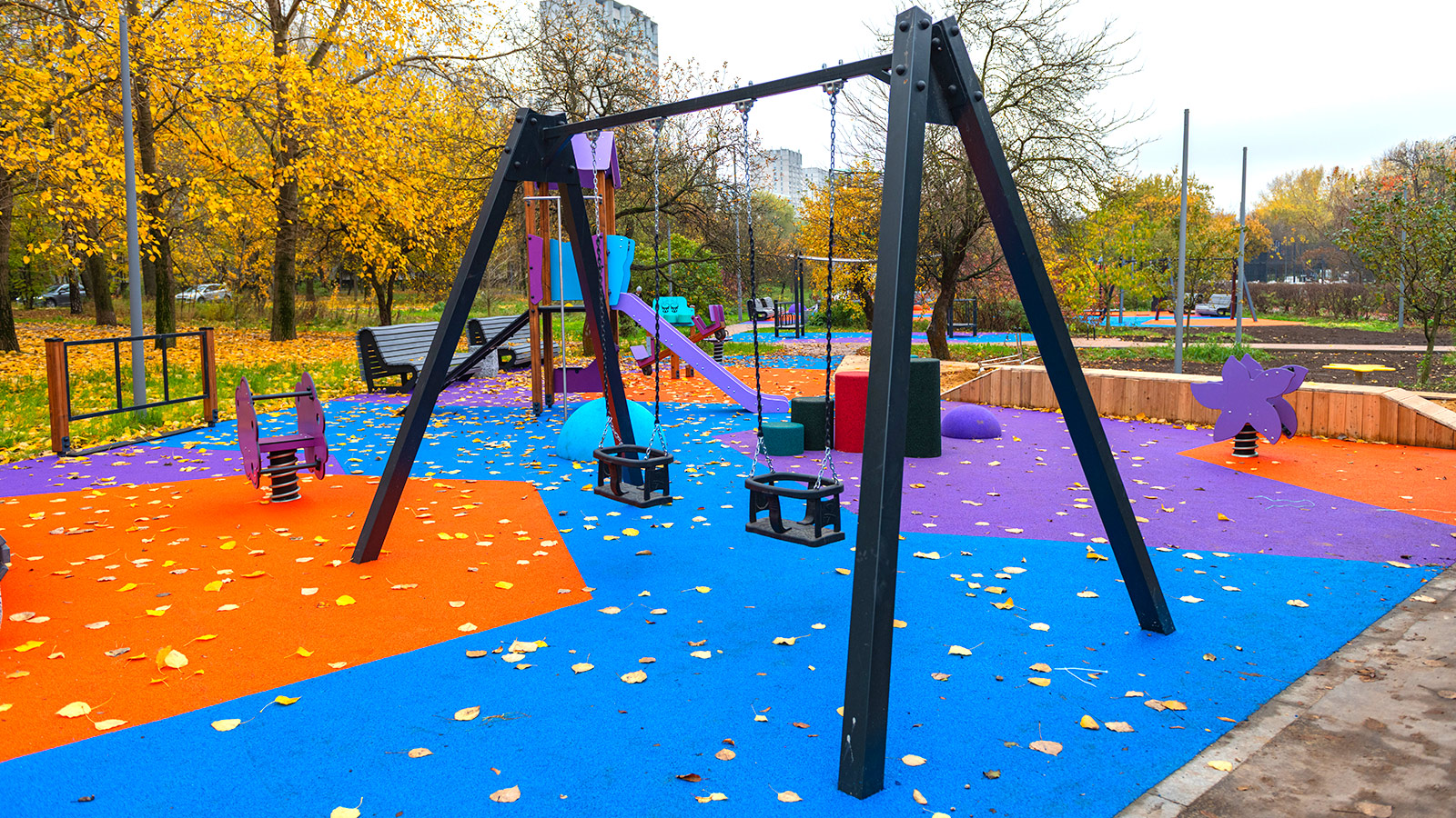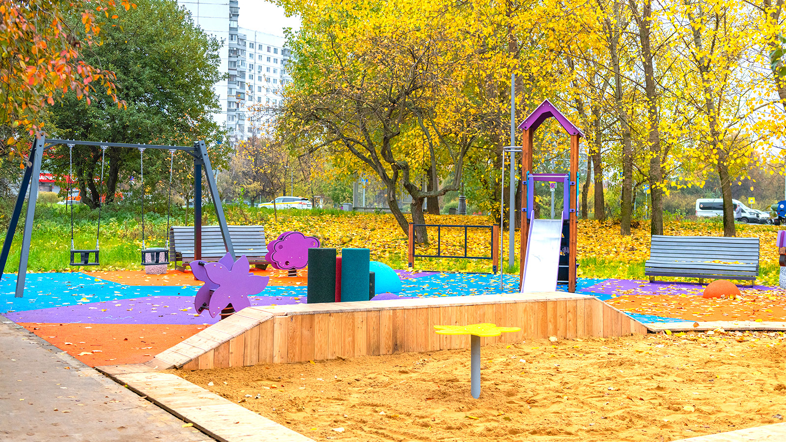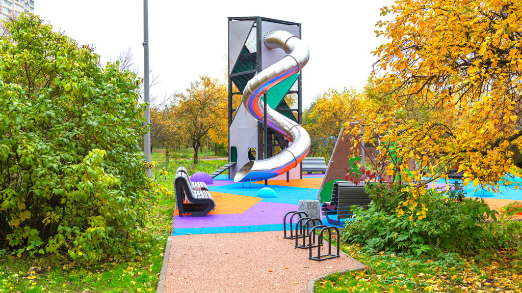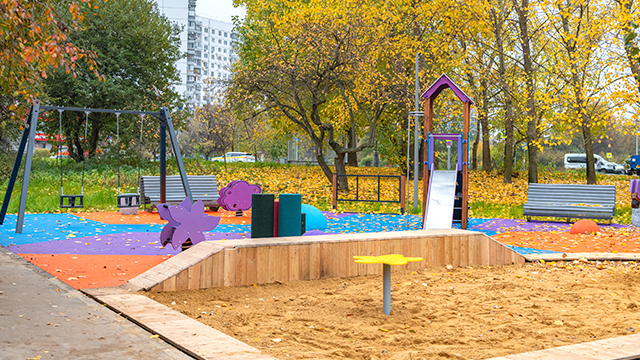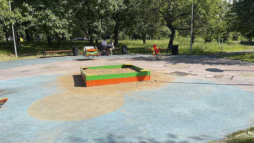 Игровые площадки для детей остались на прежних местах, но существенно обновились по наполнению. Для детей младшего возраста организовали большую песочницу, качели и карусели, а детям постарше установили 8-метровый игровой комплекс, канатную дорогу и батут.